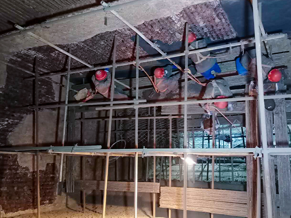 榮盛耐材施工人員正在施工 四川4x90循環流化床鍋爐內襯維修現場 鍋爐內襯不定形耐火材料施工效果 四川4x90循環流化床鍋爐···