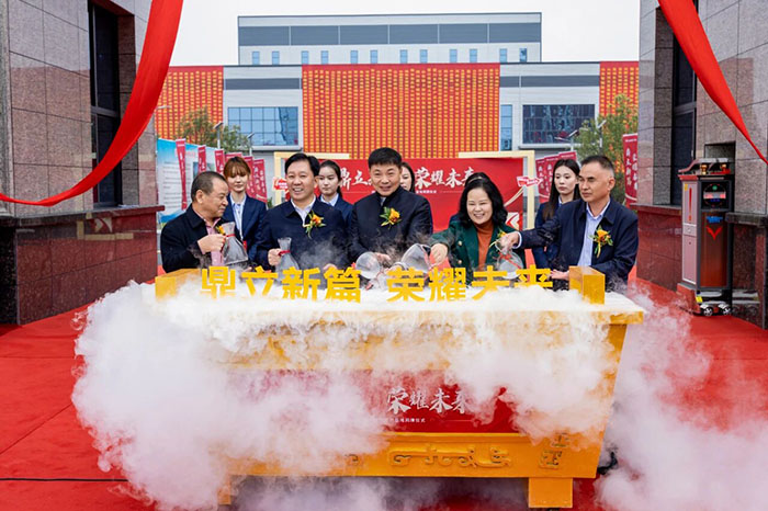 祥瑞盈門,宏圖待展。在激動人心的主題啟動環(huán)節(jié),孫琪、張新亮、孟彩虹、楚科奇、白建偉等五位領(lǐng)導(dǎo)共同登臺。隨著全場齊聲倒數(shù)“五、四、三、二、一!”,他們一同將象征著光榮與夢想的甘露注入啟動臺。瞬間,霧氣奔涌,“鼎立新篇,榮耀未來”八個大字磅礴升起,氣貫長虹!寓意著河南榮盛科技集團一個全新的時代正式開啟,未來必將大氣磅礴,景象萬千!