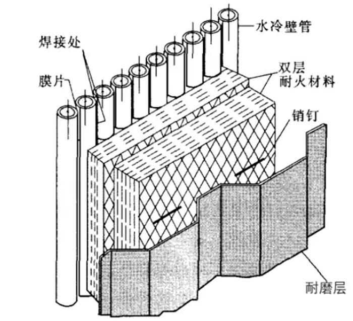 需要敷設(shè)耐磨澆注料區(qū)域還有翼墻管式水冷壁下部,尤其是在管子穿墻處,因為該區(qū)域的磨損相當(dāng)嚴(yán)重。如圖2所示,對爐內(nèi)耐火材料較厚的特殊區(qū)域,需要將耐火材料分層澆注。
