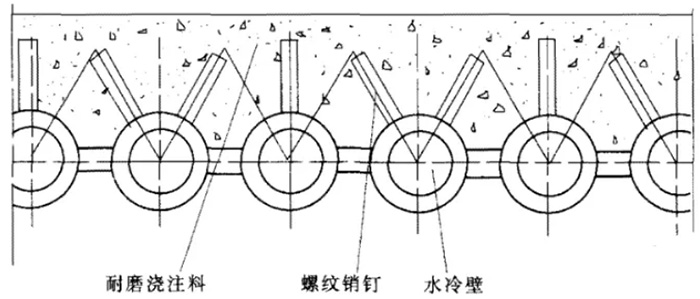 如圖1所示,為循環(huán)流化床鍋爐燃燒室下部水冷壁管上耐磨澆注料的施工工藝,耐磨材料是由焊在管子表面上的金屬銷釘固定。由于該區(qū)域為燃燒室下部密相區(qū),其物料濃度很高,混合及湍流流動非常強烈,所以磨損非常嚴(yán)重。為了防磨,在下部密相區(qū)須襯有一定厚度的耐火、耐磨澆注料。