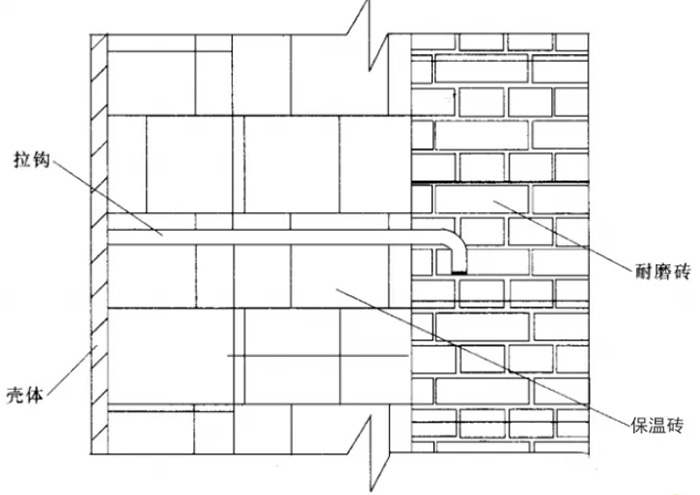 如圖4所示,為耐磨磚襯里+保溫磚型式,為解決膨脹每一定間隔留有膨脹縫,即耐磨磚與耐磨磚之間留有2mm的灰漿縫,耐磨磚分層采用焊在鋼殼上的拉鉤加固,而且為了把耐磨磚的質(zhì)量分層傳遞到鋼殼上,并在適當(dāng)高度設(shè)有高溫?zé)釓婁撝频耐屑堋_@種型式適合大面積平面或圓弧面。