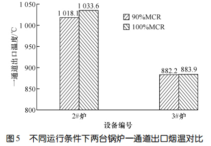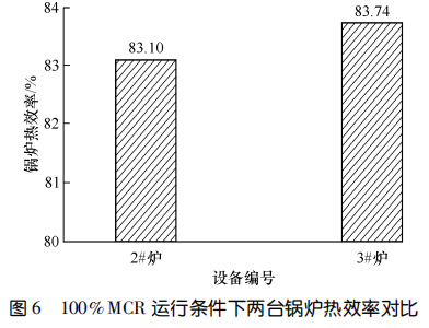 兩臺設(shè)備運行 11 個月后進行了能效測試。圖5對比了 90%鍋爐大的連續(xù)蒸發(fā)量(簡稱 MCR)和MCR 條件下鍋爐一通道的出口煙溫。圖6示出了MCR運行條件下兩臺鍋爐熱效率的對比。結(jié)果顯示:在 90%MCR 運行條件下,3#爐一通道出口煙溫比2#爐低 135.9 ℃,在MCR 運行條件下,3#爐一通道出口煙溫比 2#爐低 149.7 ℃,3#爐的熱效率比 2#爐高 0.64%。相較而言,使用膜式壁爐襯的3#爐在負荷相當(dāng)?shù)那闆r下,余熱鍋爐熱效率更高。