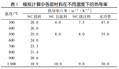 水冷壁內(nèi)襯的熱傳導(dǎo)性能需要與爐況相匹配,既要盡可能多地將熱量傳導(dǎo)出去發(fā)電,又要保證一通道出口溫度不低于 850℃。模擬計算設(shè)定耐火材料熱導(dǎo)率恒定,暫不考慮使用過程中耐火材料組成變化對熱導(dǎo)率的影響和爐襯表面積灰對爐襯熱傳導(dǎo)的影響也不考慮掛釘和錨固釘對熱傳導(dǎo)的影響。進行模擬計算時,水冷壁內(nèi)襯各工作層選取的熱導(dǎo)率見表1。